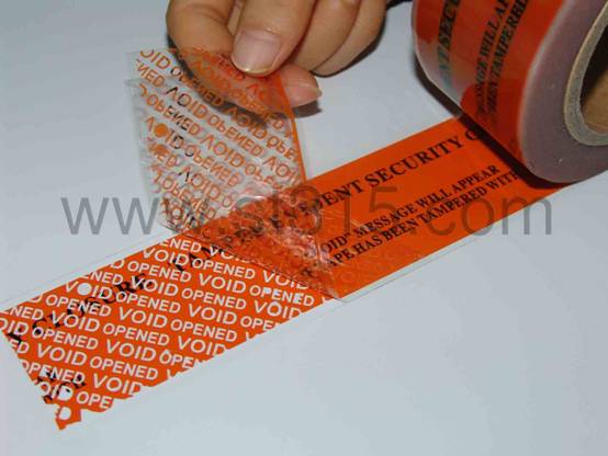 桑泰8T321T防偽膠帶為桃紅色,表面印有黑色的警示性文字(如下圖所示)。 揭起后,會有紅色鏤空的“OPENED VOID”字樣轉移到箱體表面,同時也呈現在膠帶面材上,不可復原,以示已開啟。有效地阻嚇盜竊、竄貨等不法行為的肆行。