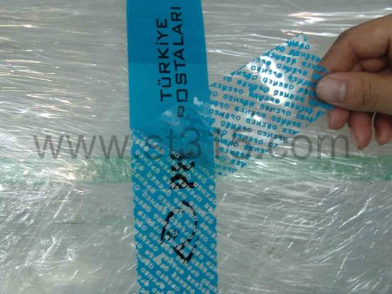 桑泰9T2108T為藍(lán)色全轉(zhuǎn)移型防偽膠帶。 揭起后,會(huì)有藍(lán)色鏤空的“OPENED”字樣轉(zhuǎn)移到箱體表面,同時(shí)也呈現(xiàn)在膠帶面材上,不可復(fù)原,以示已開(kāi)啟。有效地阻嚇盜竊、竄貨等不法行為的肆行。